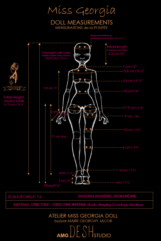 Avant de procéder à quelconque modelage, j’ai fait un compte rendu de mes créations du passé (poupées uniques). J’ai pris le temps d’analyser plusieurs de mes poupées et fait un compte rendu de ce que j’aimais. Cette analyse m’a permis de mieux connaître l’esthétisme que je souhaitais réaliser. Sur une durée d’un mois, j’ai dessiné un premier dessin technique avec l’aide de papier quadrillé. Avec ce dessin, j’ai tracé la silhouette de la poupée, puis apporté plusieurs modifications. La première modification fut la grandeur finale de la poupée. Dès le départ, je savais que Miss Georgia serait l’incarnation d’une jolie jeune femme aux proportions réalistes. En d’autres mots, elle ne serait pas un mannequin de mode, mais une créatrice mode spécialisée dans les accessoires de luxe (sacs et valises). Pour y arriver, je devais déterminer le nombre de têtes que je voulais pour déterminer sa grandeur finale. Le nombre de six têtes et demie était idéal, puisque le nombre de huit têtes équivaut à la norme des poupées mannequins de mode sur le marché (Barbie, Kingdom Doll, Integrity Toys).